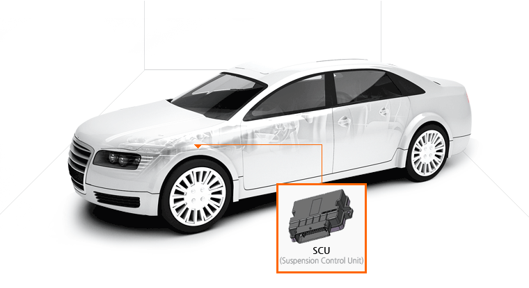 •SCU The variable suspension system controls speed and condition of the vehicle to adjust the level of vibration absorption for making it soft at low speed and hard at high speed.