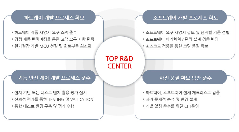 | SW팀 | 전장부품 전문 연구개발 프로세스 자동차에 전기전자 부품적용이 확대됨에 따라 기능안전 프로세스 준수 (MISRA-C, Code Sonar)와 HARA를 통한 안전 목표 수립으로 완벽한 프로그램을 개발하고 있습니다. |